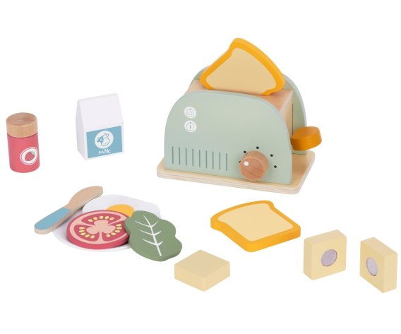 Zestaw Tooky Toy „Mały Kucharz” to kreatywna zabawka dla dzieci od 3. roku życia, która pozwala wcielić się w rolę kucharza przygotowującego pyszne śniadanie. Zestaw zawiera realistyczny drewniany toster oraz aż 14 akcesoriów, takich jak chlebki, plasterki sera, warzywa, jajko sadzone, kartonik mleka, przyprawy, talerzyk, menu i nóż. Wszystkie elementy wykonane są z drewna i pomalowane bezpiecznymi dla dzieci farbami.