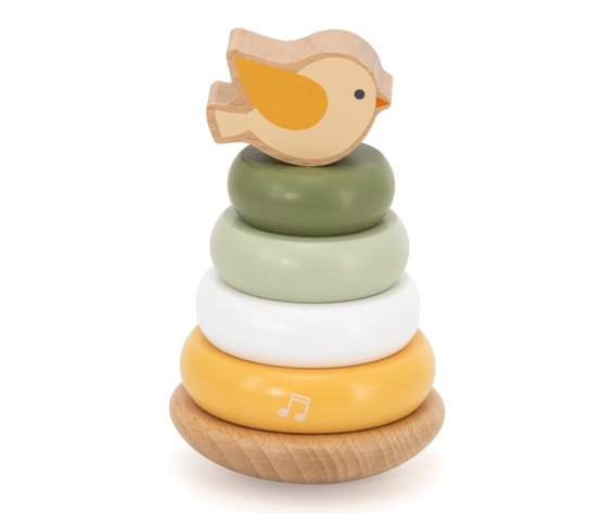 Dziecko ma za zadanie nakładać kolorowe pierścienie na drewniany patyczek, tworząc wieżę, a na jej szczycie może umieścić uroczego ptaszka. Kołysząca się podstawa sprawia, że zabawka delikatnie buja się na boki, co czyni zabawę jeszcze ciekawszą.