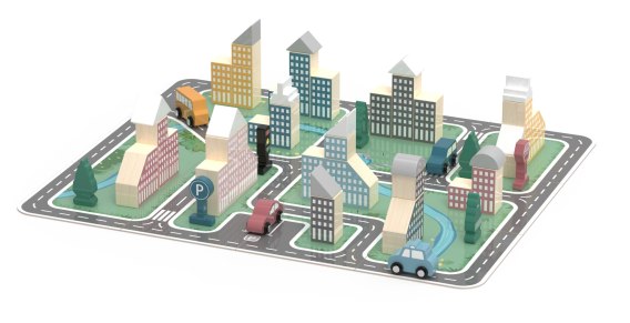 Wiaderko z klockami skrywa prawdziwy skarb - elementy które pozwolą stworzyć własne miasto. Na elementach planszy znajduje się sieć dróg - którymi autka mogą dowolnie się przemieszczać. Na planszy rozmieszczone zostały także rzeki.